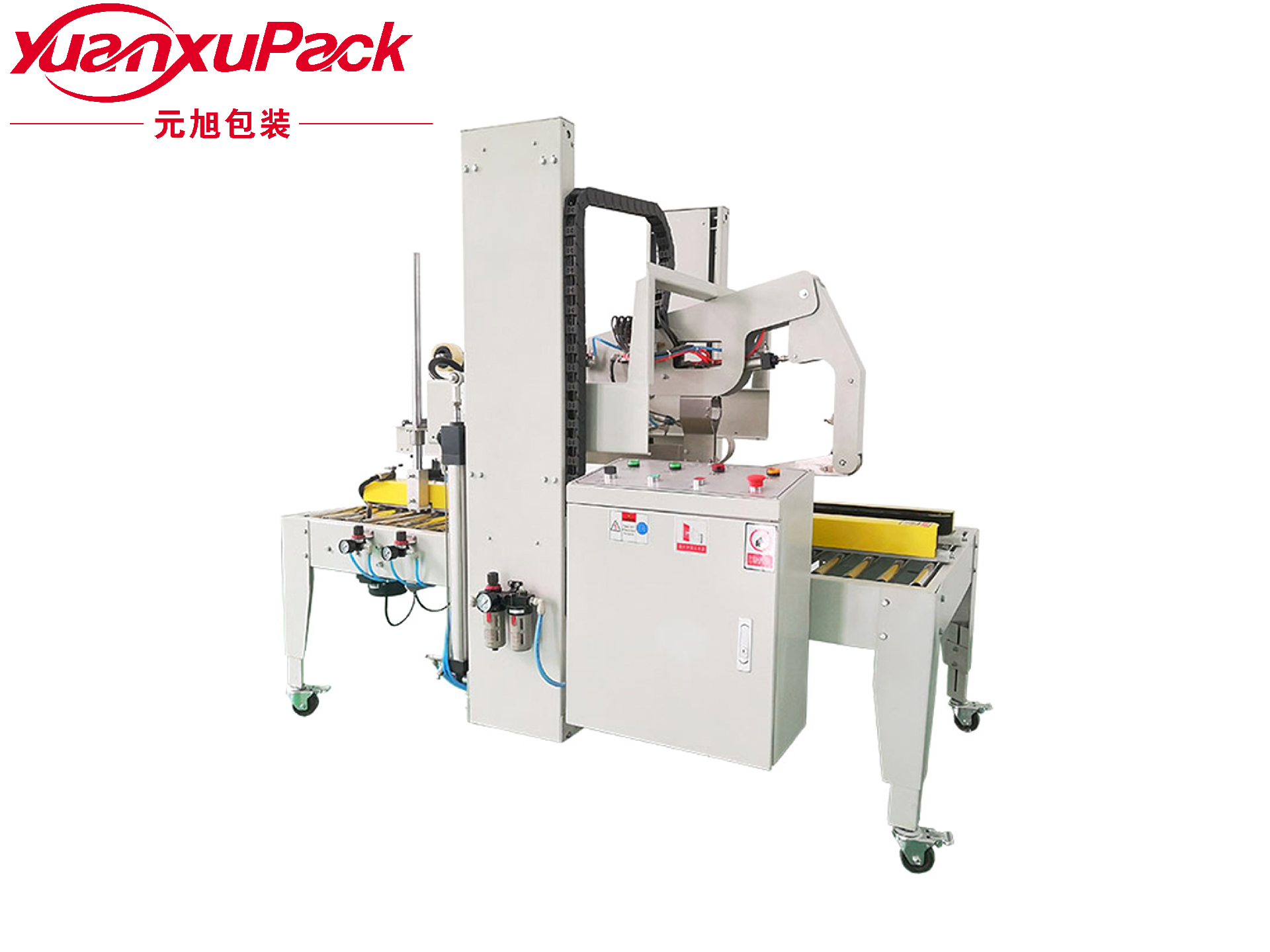 本机采用上下驱动的方式主要适用于纸箱的封箱包装,既可单机作业,也可与流水机配套使用,广泛应用于在家用电器、纺织、食品、百货、医药、化工等行业。封箱机采用即贴胶带封纸箱封口,经济快速、容易调整,可一次完成上、下封箱动作,采用印字装置,更可提高产品形象。